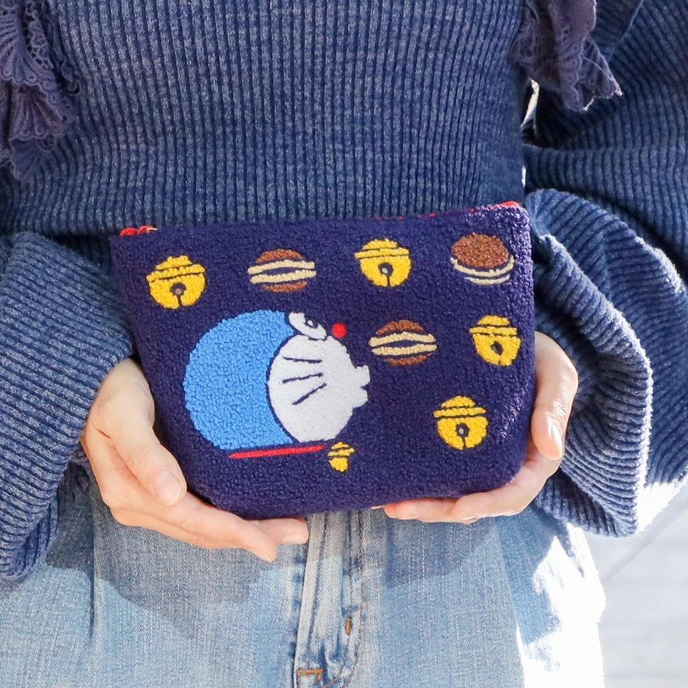 ドラえもんの横顔と大好物のどら焼きや鈴を、もこもこのサガラ刺しゅうでデザインしたトートバッグと舟形ポーチです。いずれも背面はしっかりとした厚めのキャンバス生地で、トートバッグには内ポケットと、開閉部分にマグネットボタンが付いています。