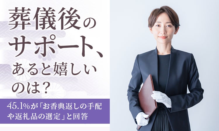 一番多かったのは「お香典返しの手配や返礼品の選定」で45.1%、次に「相続の相談や手続き代行サービス」が38.7%、「法事や葬儀後の食事(レストラン手配やケータリング)」が37.6%と続きました。