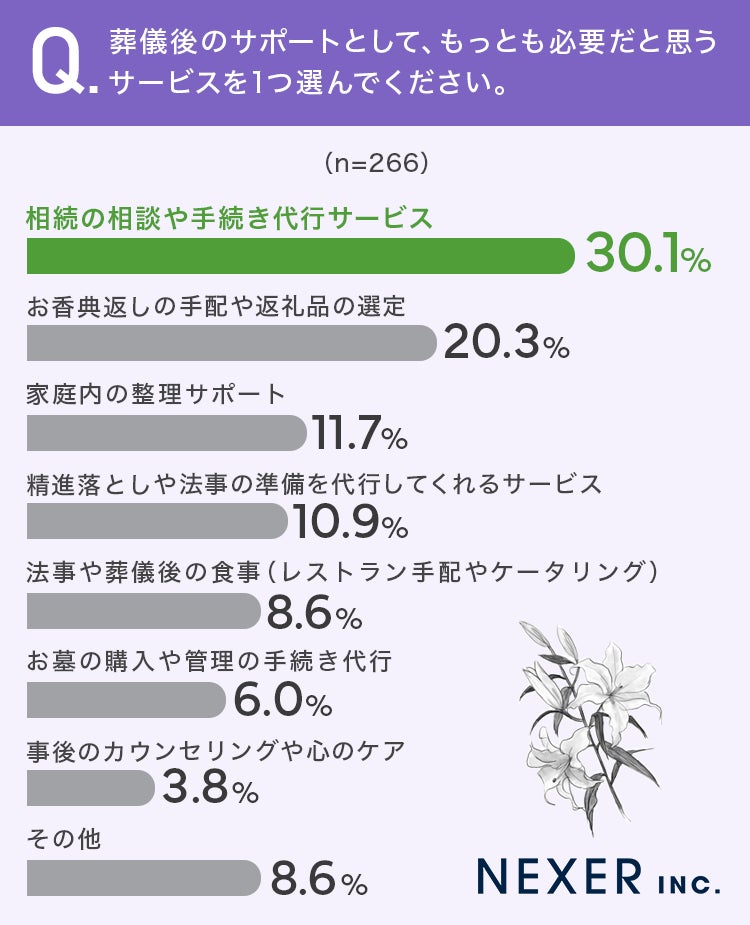 葬儀後のサポートとしてもっとも必要だと思うサービスは、「相続の相談や手続き代行サービス」「お香典返しの手配や返礼品の選定」「家庭内の整理サポート」がトップ3で選ばれました。
