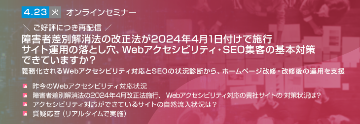 2024年4月の障害者差別解消法の改正法施行で、民間企業のWebアクセシビリティ(※)対応が注目を集めています。「Webアクセシビリティの対応に関する改修」「改修後の運用」や「SEO集客の基本対策」が課題となっているお客様企業も多いのではないでしょうか。そこで本セミナーでは、昨今のWebアクセシビリティ対応状況やWebアクセシビリティ対応したサイトの自然流入状況などをご説明し、Webアクセシビリティ対応の課題を解決するサービスをご紹介します。