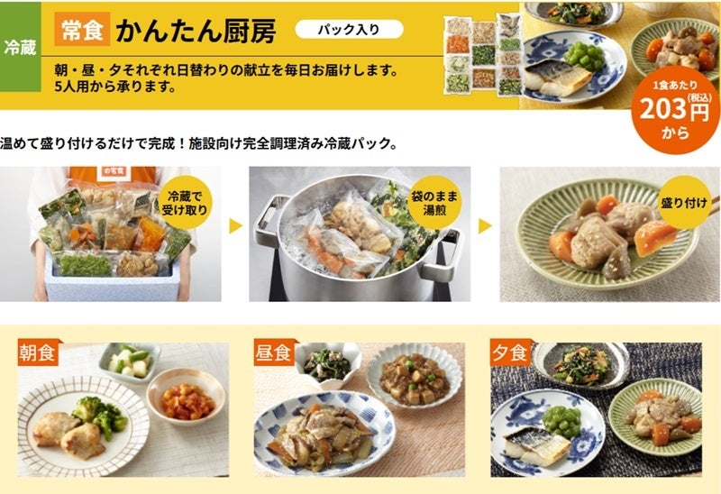 福祉施設向けのお食事として湯煎で温めるだけでかんたんに食事のご用意ができる冷蔵のパック惣菜「かんたん厨房」をご用意しています。冷蔵なので風味と食感が冷凍と違います。また、その日の分を毎日お届けいたしますので冷蔵庫のスペースに困らない、冷凍より温め時間が短く時短になると施設様よりご好評をいただいております。