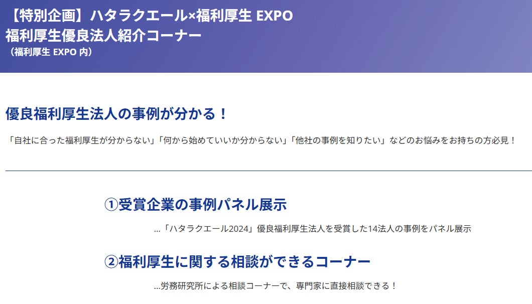 「ハタラクエール2024」優良福利厚生法人を受賞した14法人の事例パネル展示などがございます。