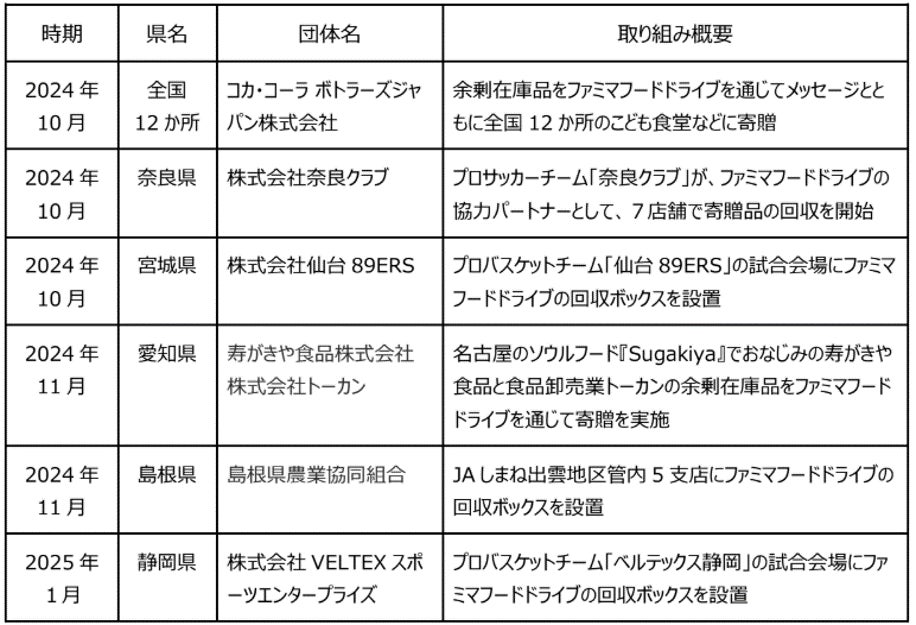 店舗に寄贈いただくお客さまに加え、スポーツチームや飲食品メーカーをはじめとする多くのステークホルダーの協力等をいただきながら、以下のような新たな連携や協業を進めました。これにより、寄贈された食料品の量はさらに増加し、より多くの方に支援を届けることができました。協力パートナーからは「学校給食がない冬休みの時期に物価高で更に困難度が増しているひとり親家庭にお届けすることができました」、店舗からは「ファミマフードドライブをきっかけに、協力パートナーと繋がりが出来たことで、今までにない形の地域貢献になっていると感じています。取り組みが大きな輪となり、これからも地域のお客さまとともに地域を盛り上げていきたいです。」というようなお声をいただいております。