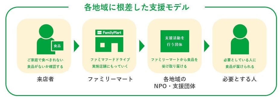 「ファミマフードドライブ」は、ご家庭にあるもったいない食品をファミリーマート店舗にお寄せいただき、地域のこども食堂やフードパントリーなどの活動を行うNPOや社会福祉協議会などの協力パートナーを通じて、食支援が必要な方々へお届けする取り組みです。ファミリーマート店舗を回収拠点とすることで、地域の皆さまが、いつでも気軽に社会貢献活動に参加できることが特徴です。
