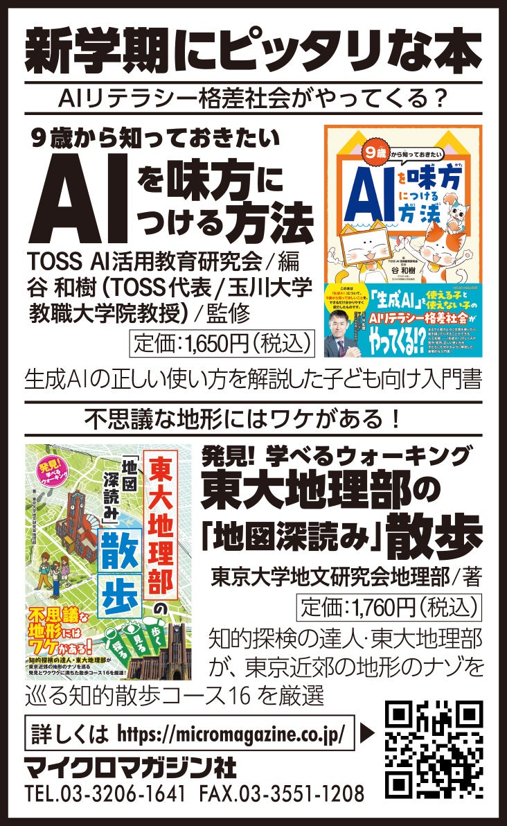 マイクロマガジン社(東京都中央区)は、『9歳から知っておきたい AIを味方につける方法』『発見! 学べるウォーキング 東大地理部の「地図深読み」散歩』を4月11日の朝日新聞に掲載いたしました。