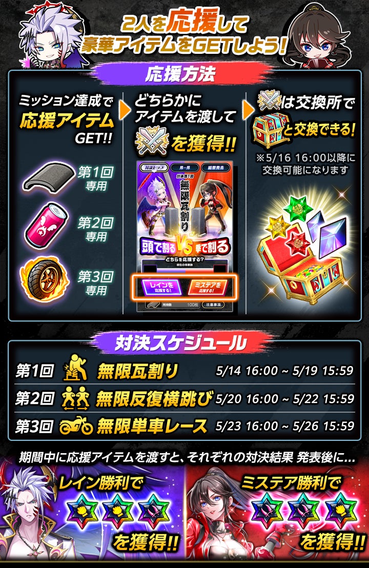 加えて、今回のイベントでは「対決! <悪魔殺し>VS<拳の女>!!」と題した投票形式の対決イベントを開催しております。投票した枚数や投票結果に応じて、キャラクターを強化できる「メモリアルルーン」などのアイテムを獲得できます。「対決ミッション」のクリアで獲得できるアイテムを集め、ぜひご参加ください。