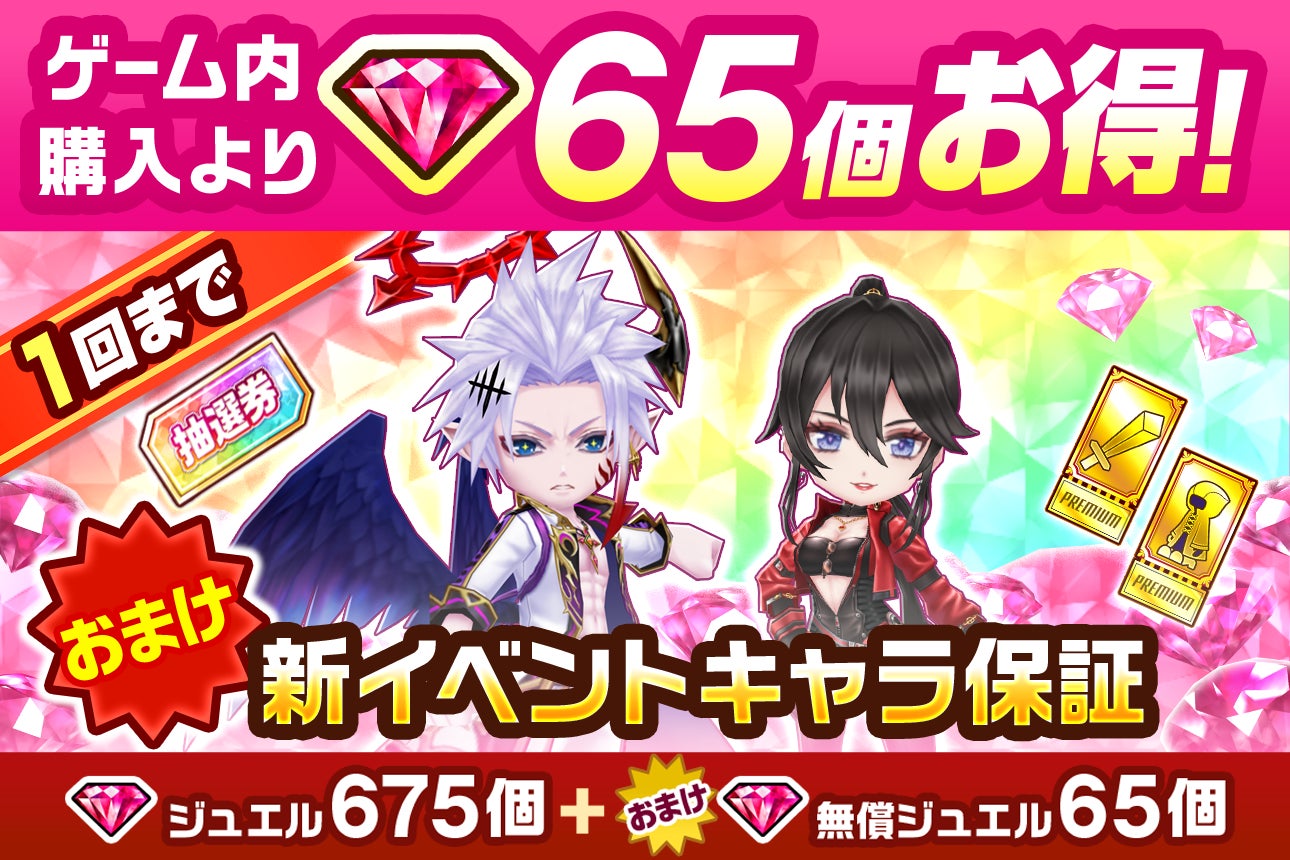 内容物:「ジュエル」675個、「無償ジュエル」65個、「新イベントキャラ保証」など
