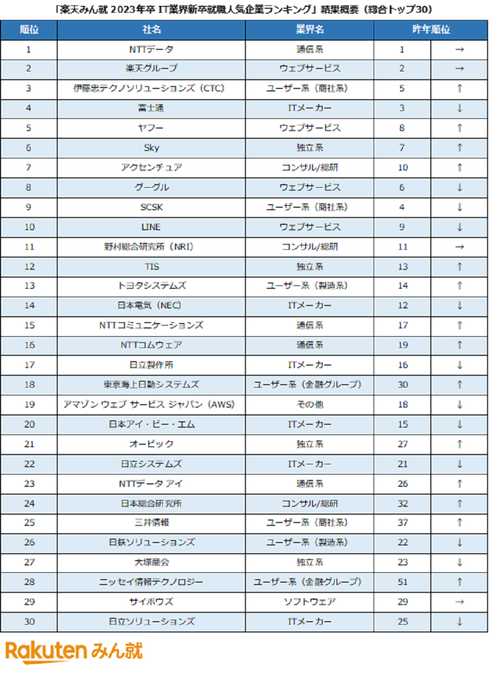 ■「楽天みん就 2023年卒 IT業界新卒就職人気企業ランキング」結果概要(総合トップ30)