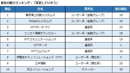 5つの観点を細分化した詳細項目において、「技術力がありそう」、「成長性が高そう」など様々な項目について調査する中で、「会社の魅力」ランキングの「安定していそう」の項目に着目しました。トップ10にランクインした企業を見てみると、ユーザー系企業とNTTグループ企業が目立ち、10社中9社が総合順位トップ30にもランクインする結果となりました。特に、東京海上日動システムズ(昨年総合30位→18位)、ニッセイ情報テクノロジー(昨年総合51位→28位)など、大手企業から情報システム部門を独立させたユーザー系企業が昨年から大きく順位を上げました。また、NTTグループ企業においては、3位のNTTデータ アイ(昨年総合26位→23位)、5位のNTTコミュニケーションズ(昨年総合17位→15位)、6位のNTTデータ(昨年総合1位→1位)、7位のNTTコムウェア(昨年総合19位→16位)と4社がランクインしており、総合ランキングにおいてもこの4社すべてがトップ30にランクインしています。このように、学生から「安定していそう」と思われている企業が軒並み順位を上げていることから、志望する企業に「安定感」を求める学生が増えている傾向がうかがえます。