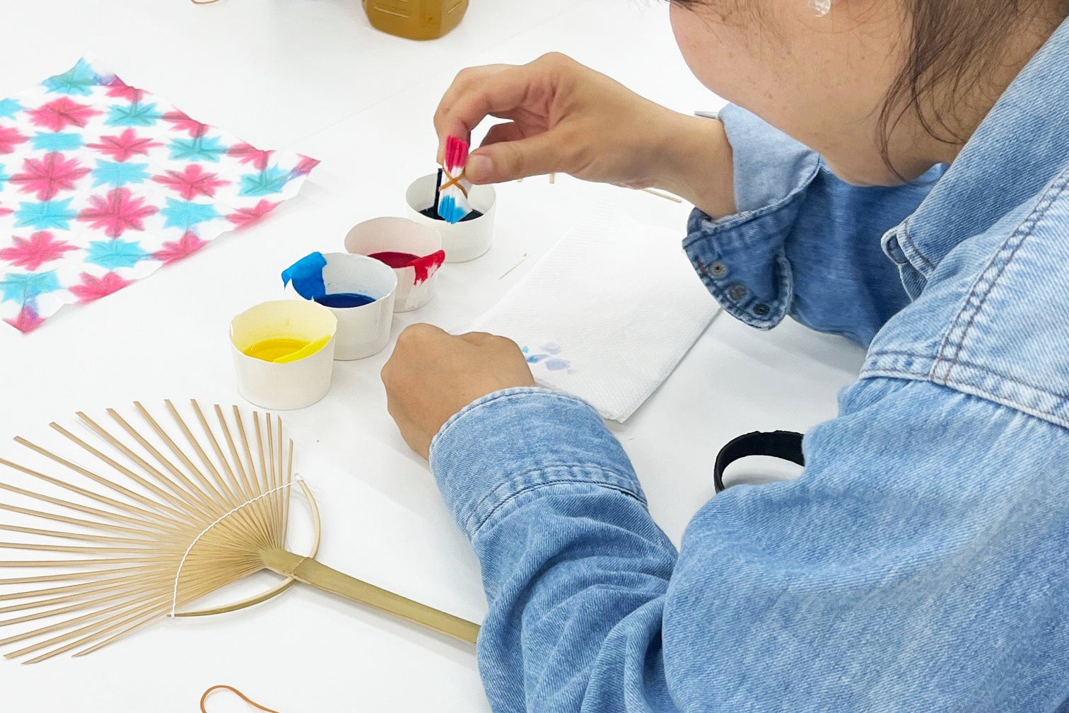 手漉き和紙を折り、お好きな色で染める「折り染め」の手法で、自分だけの模様に染めることができます。染め上がった和紙はうちわまたは風鈴を制作いただくか、そのままお持ち帰りいただくことが可能です。折り方や色の置き方次第で模様が変わるため、年齢を問わず誰でも楽しめるアート体験です。