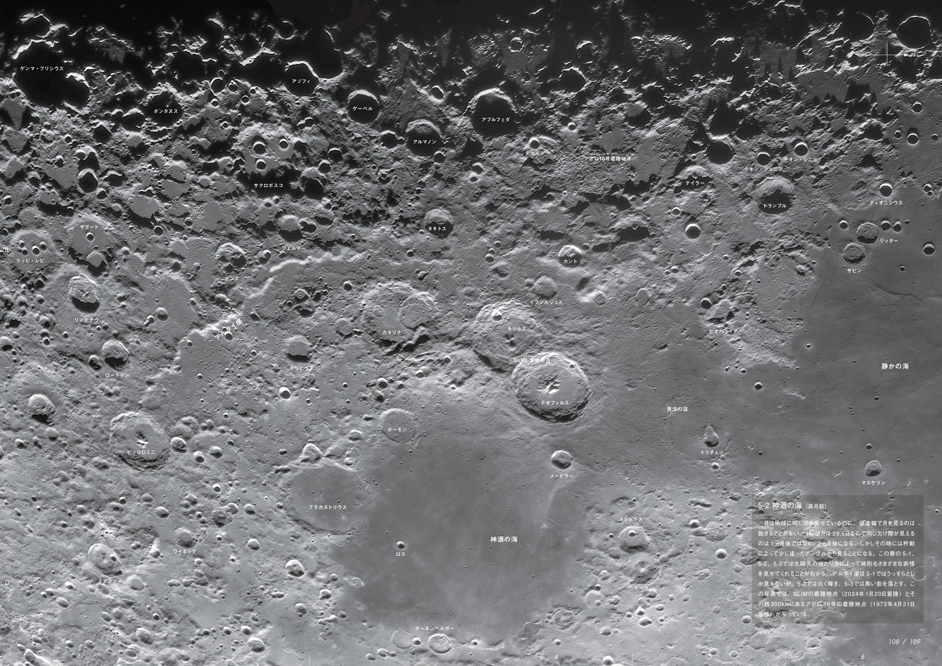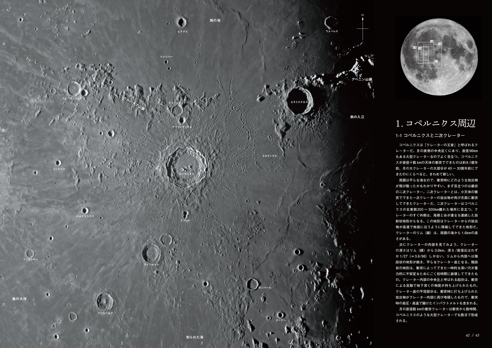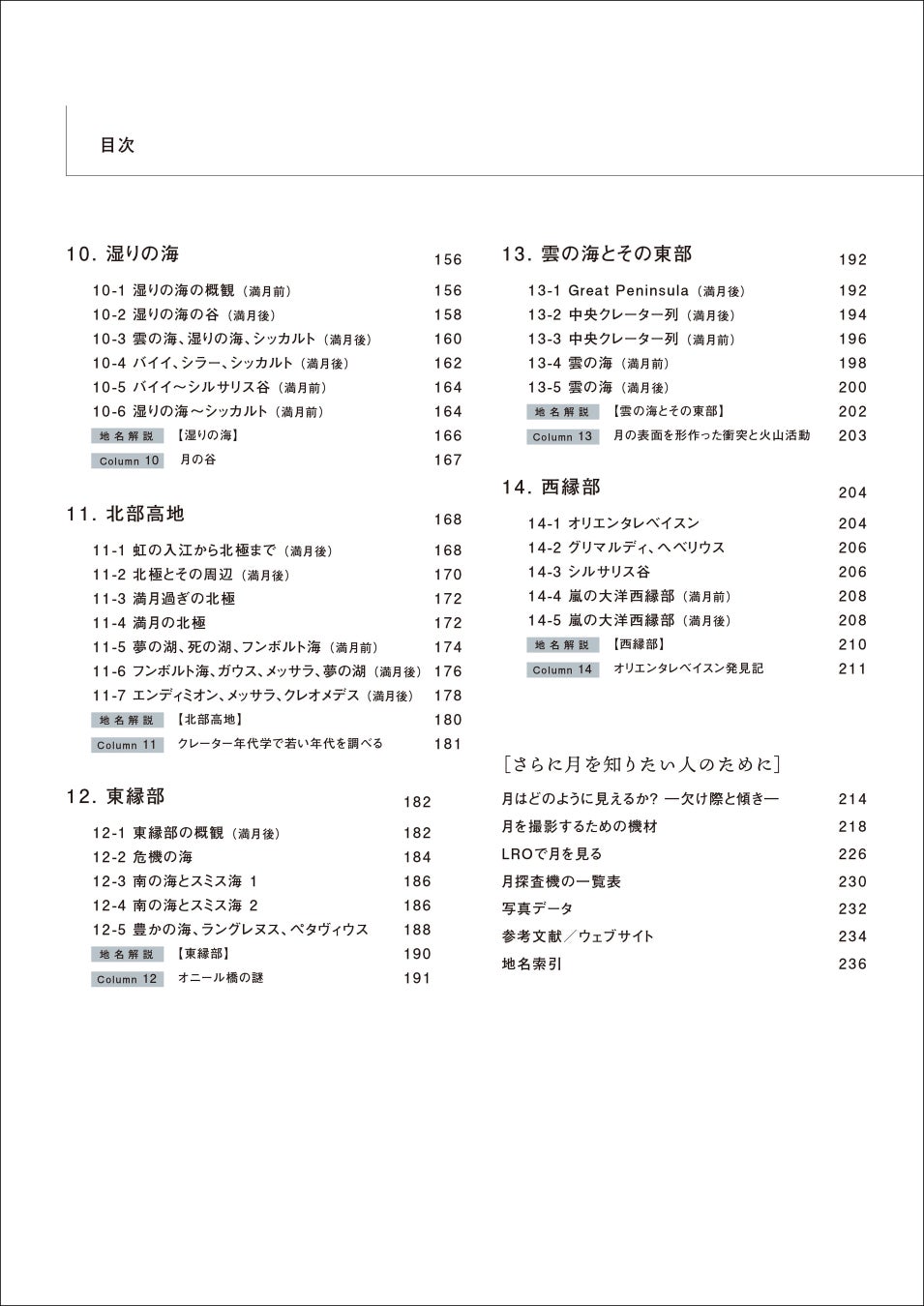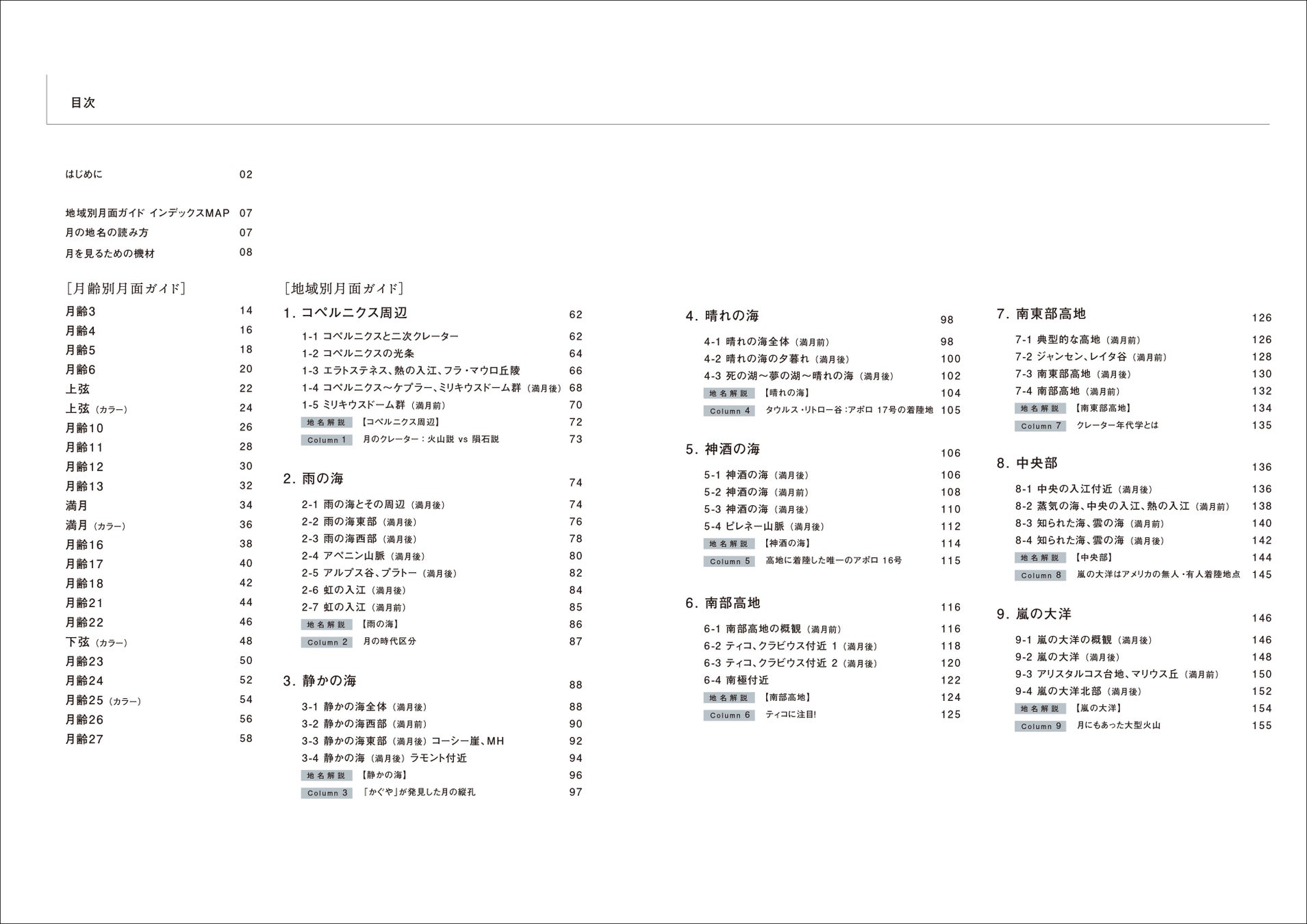 本書は、双眼鏡や天体望遠鏡を使って実際に月を観察する際に分かりやすいよう、月齢ごとや月の表側をエリアに分け、月の地形(クレーター、山脈、谷など)の位置を明示して、その地名・地形解説を楽しむことができます。
