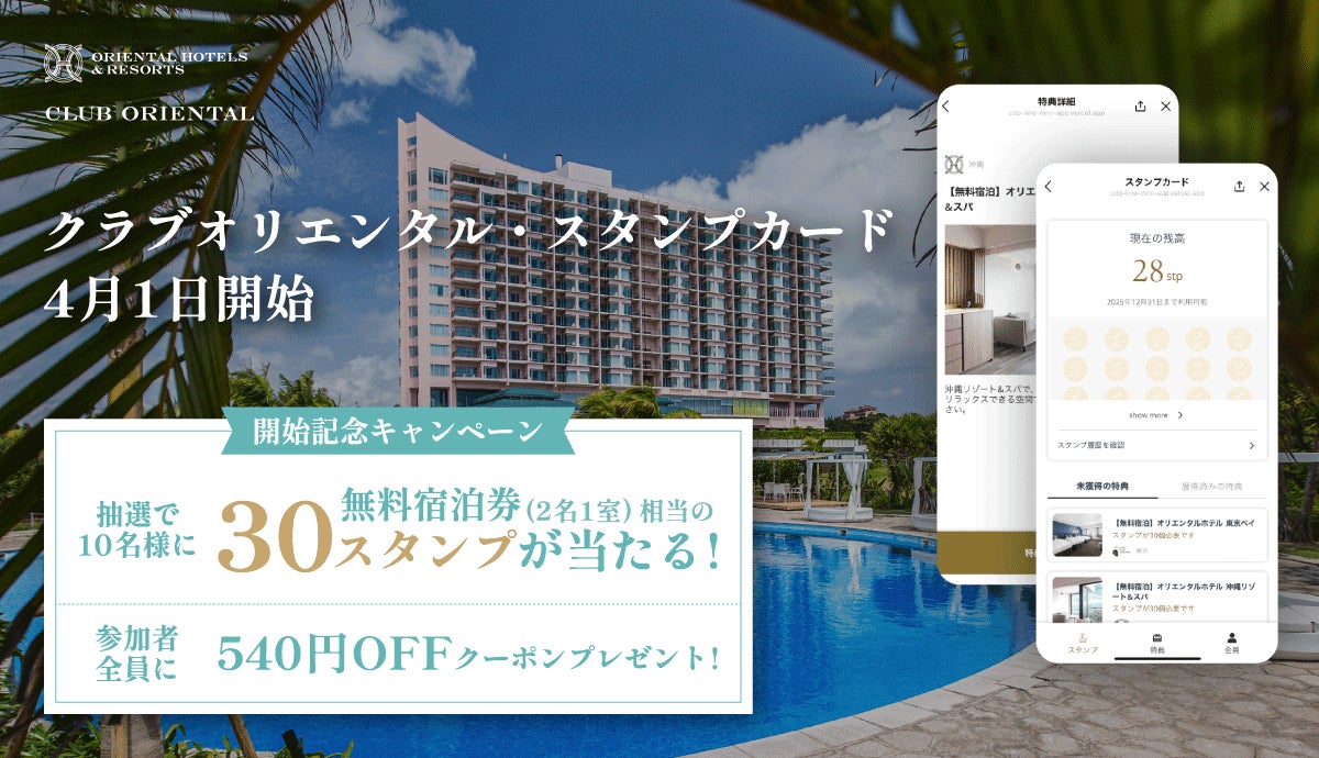 CLUB ORIENTAL(クラブオリエンタル)は“魅力的な特典があなたの旅をもっとお得に”をモットーに2021年に発足し、全国のオリエンタルホテルズ&リゾーツの15ホテル(2025年4月1日時点)でご利用いただけるメンバーシップです。(詳細:https://www.oriental-hotels.com/stamp-card/)