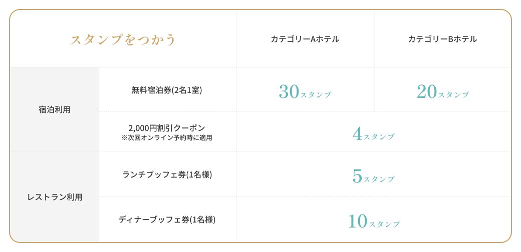 宿泊やレストランのご利用でたまったスタンプは宿泊無料券、宿泊割引券、レストラン無料券のどちらにでもご利用いただくことが可能です