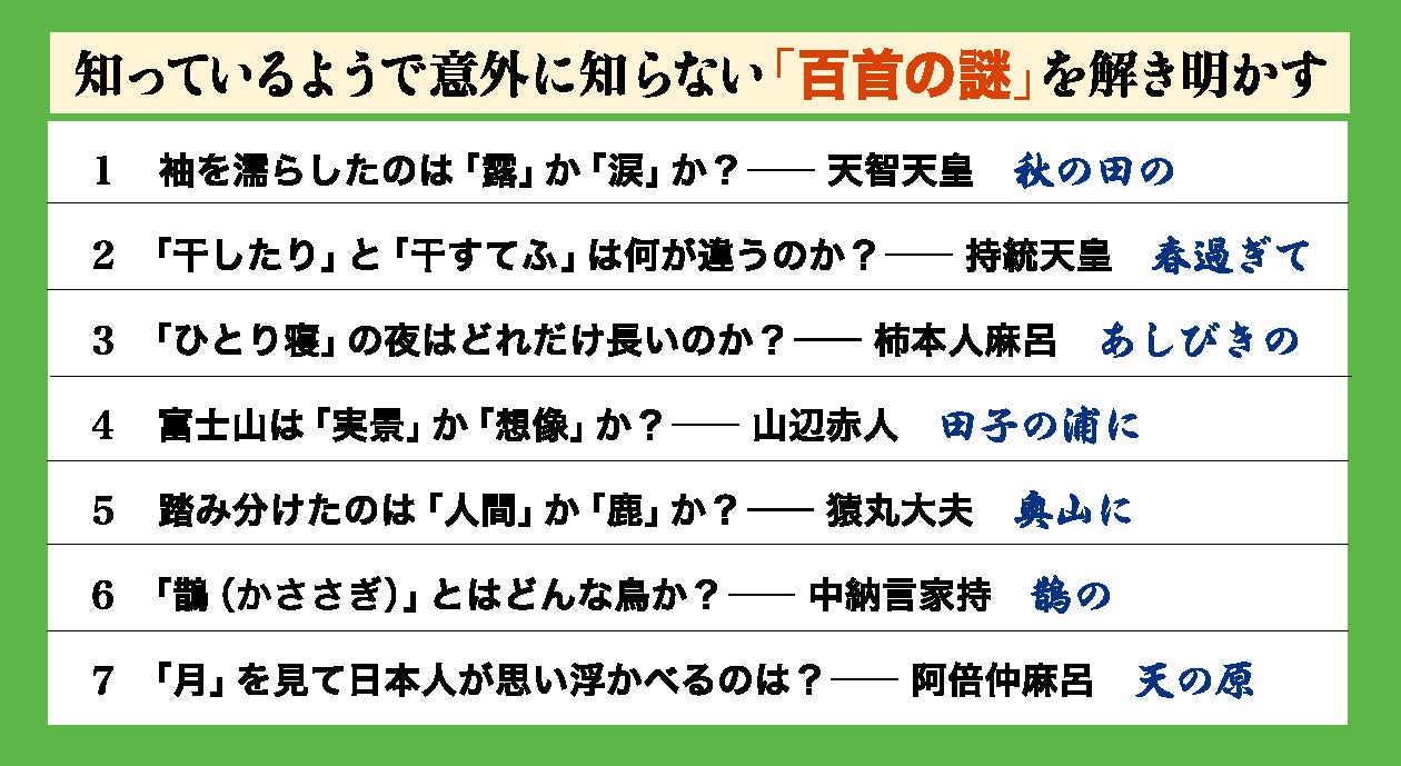 日本人はなぜ「儚さ」に美の本質を見出したのか。なぜ「主語」を明記せずに歌を詠んだのか。なぜ「本歌取り」で新しさを表現しようとしたのか。なぜ「擬音語」や「言葉遊び」を多用したのか。『百人一首』全訳で日米の翻訳賞を受賞した英文学者が、和歌に秘められた「100の謎」を一つ一つ解き明かします。
