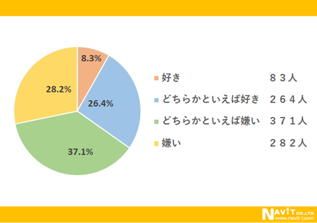 青汁の好き嫌いについての回答は「好き」(83人)に「どちらかといえば好き」(264人)を加えると347人。反対に「嫌い」(282人)と「どちらかといえば嫌い」(371人)の合計は653人。「好き」と「嫌い」の比率はほぼ1対2でした。