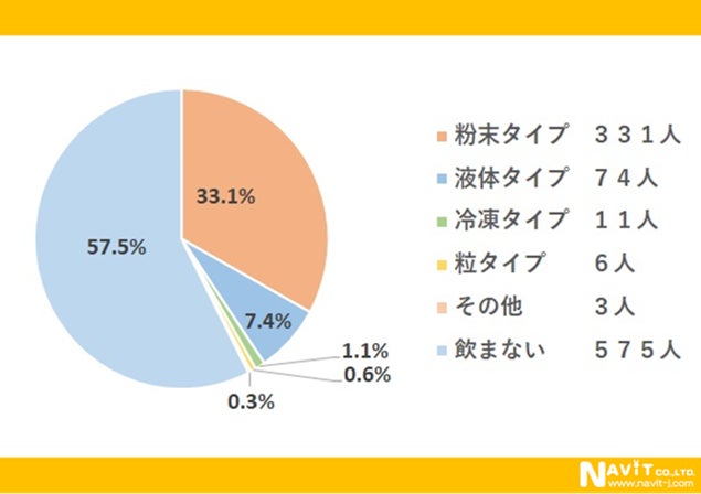青汁のタイプは「粉末タイプ」が最も多くて331人。ぐんと下がって「液体タイプ」(74人)、「冷凍タイプ」(11人)、「粒タイプ」(6人)が続いています。