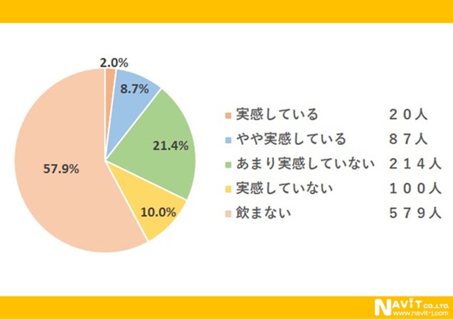 青汁の効果を「実感している」人は20人。「やや実感している」(87人)を合わせて107人。これに対して「実感していない」(100人)と「あまり実感していない」(214人)の合計は314人。医薬品と違い効果をはっきり感じるのは難しいのが悩ましいところですね。