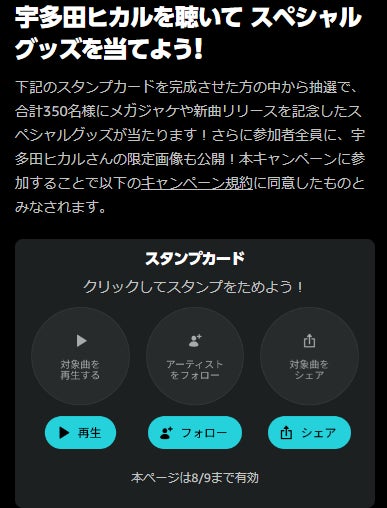 Amazon Music、期間限定のスタンプカード機能を使ったファンとアーティストのつながりを提供する試み「宇多田ヒカルを聴いてスペシャルグッズを当てよう」キャンペーンを本日より開始