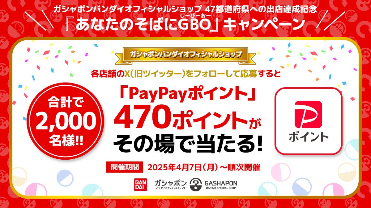 全国の『ガシャポンバンダイオフィシャルショップ』各店舗のX(旧ツイッター)のアカウントをフォローして応募すると、各店舗10名さま、合計約2,000名さまにその場でもらえる「PayPayポイント」470ポイントをプレゼントします。