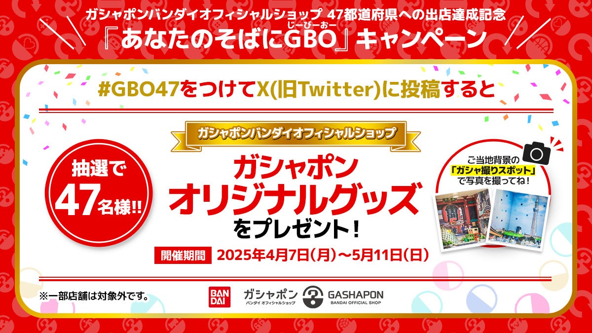 ガシャポンファンの皆さまに、日頃の感謝の気持ちを込めて、47都道府県への出店達成を記念したキャンペーンを全国のGBOで開催します。
