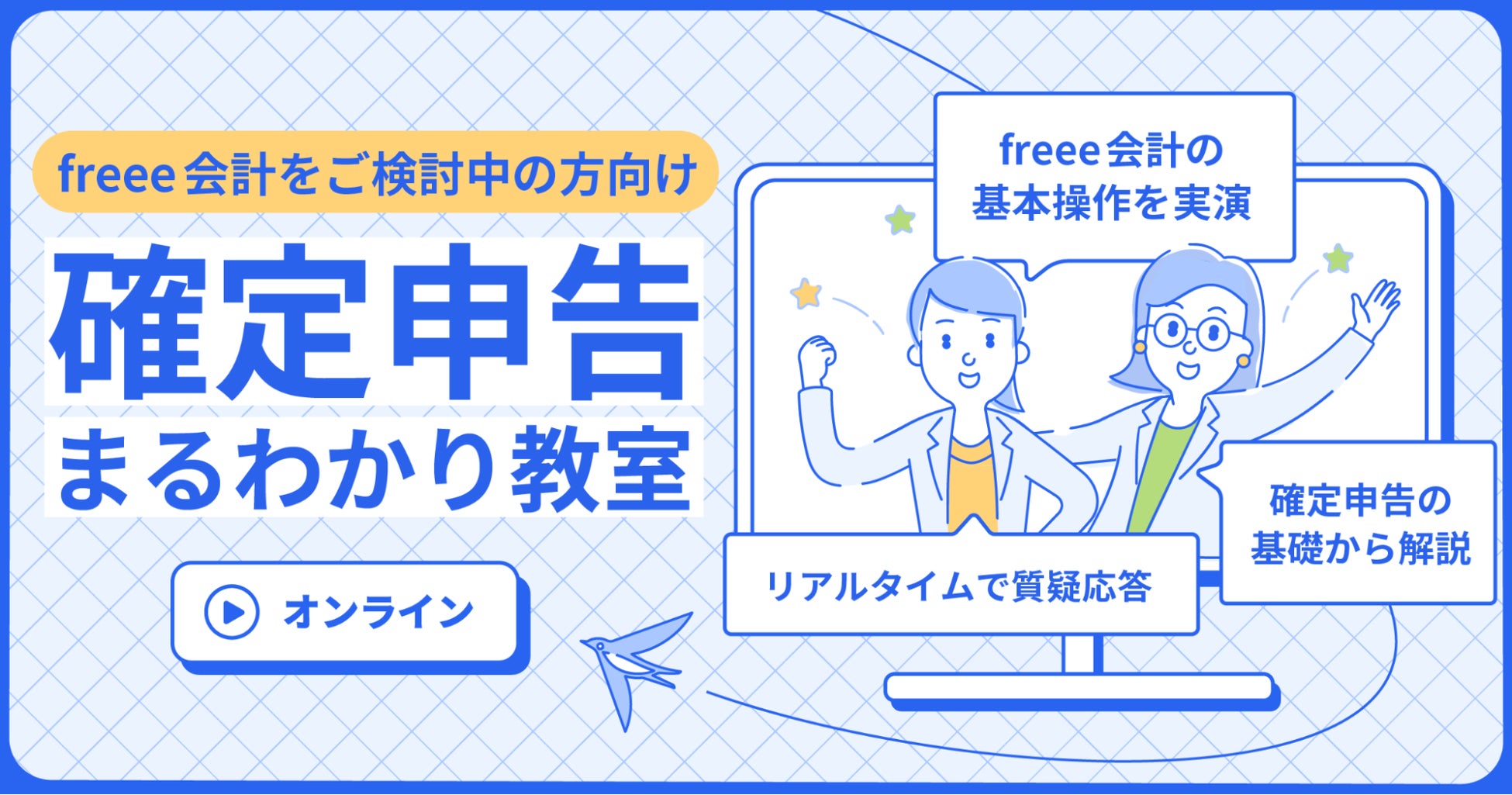 確定申告の基礎解説や、freee会計の基本操作の実演・リアルタイムで質問が可能なオンラインセミナー「確定申告まるわかり教室」を毎日開催します。スマートフォンだけでできる確定申告の方法も実演しますのでお気軽にご参加ください。