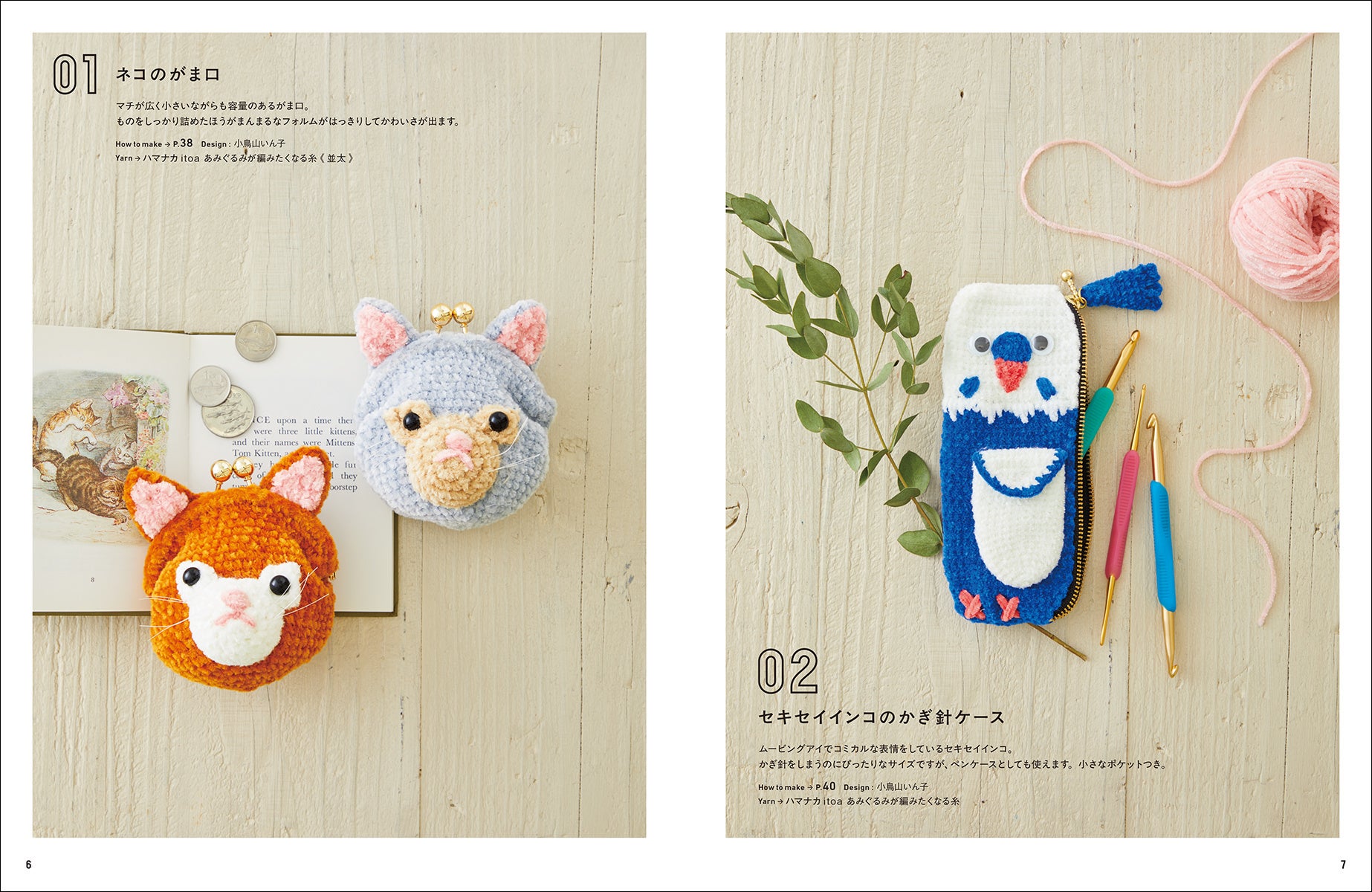 この本では、ポーチ、スリッパ、マフラーなどに動物のあみぐるみがくっついた、普段使いできる雑貨を集めました。