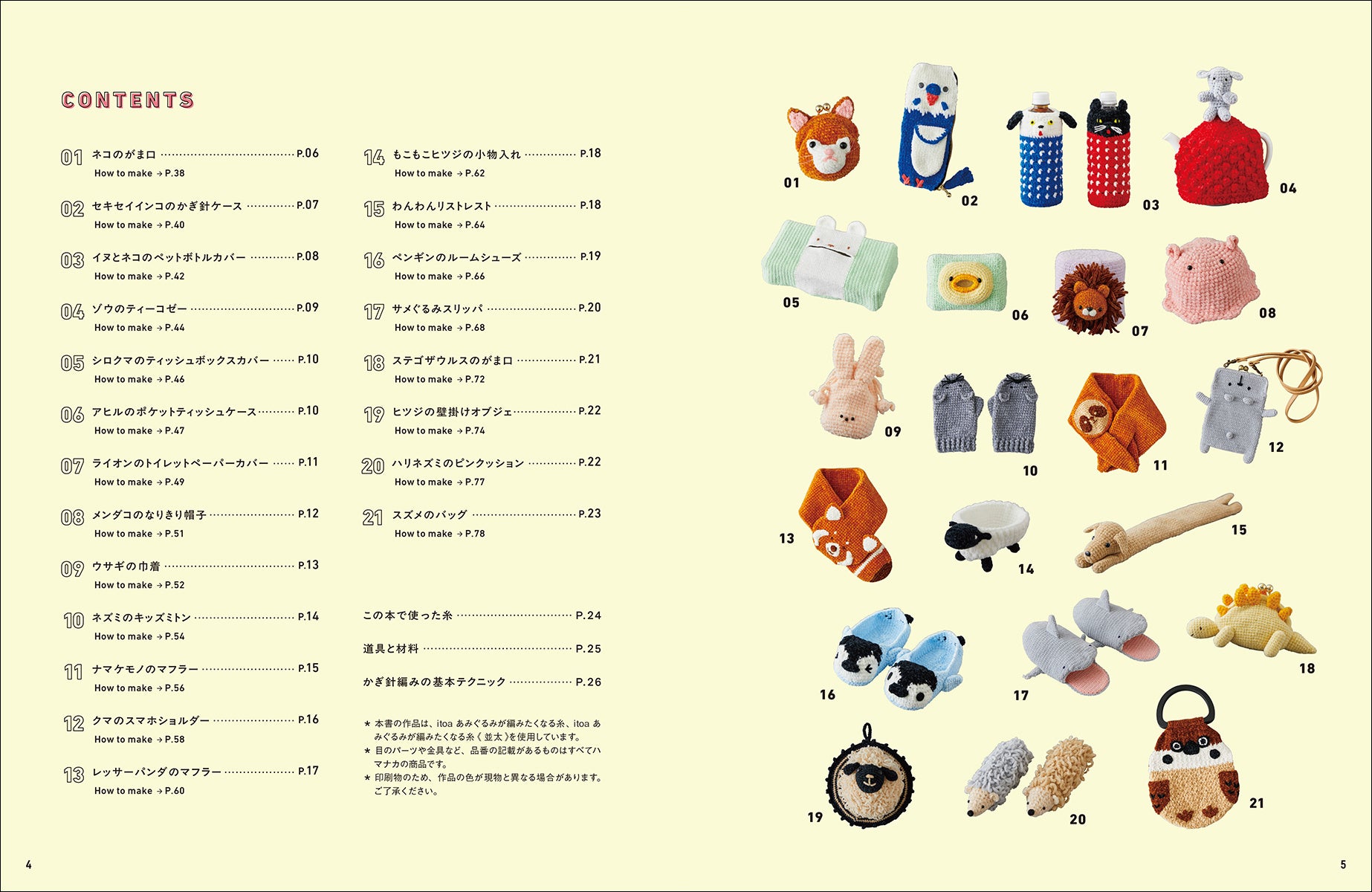 ポーチ、スリッパ、マフラー、ティーコゼーなどに動物モチーフのあみぐるみがくっついた、普段使いできる雑貨21点の作り方を紹介。