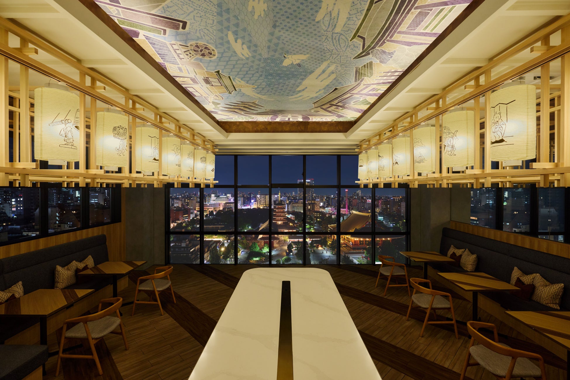 また、天井には浅草観光に欠かせない街のスポットを描いた天井画が新登場。江戸の庶民が見えない部分でお洒落を楽しんだことに着想を得て、天井画の至るところに江戸時代から親しまれる紋様を散りばめ、「粋」を表現します。