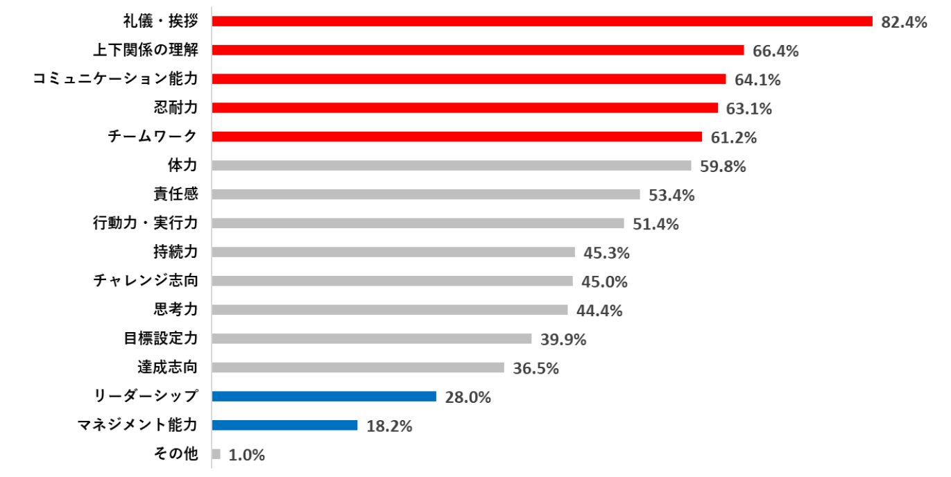 部活での経験を通して得た自身の強みは、「礼儀・挨拶(82.4%)」「上下関係の理解(66.4%)」「コミュニケーション能力(64.1%)」「忍耐力(63.1%)」「チームワーク(61.2%)」が上位だった。運動部学生は競技成績の向上を目指すという共通目標に向かい、指導者や他学年、同級生など他者とコミュニケーションをとる場面が多く、かつ固定化されたコミュニティで活動をするため、これらの能力が高いと推察される。一方で、回答が少なかったのは「リーダシップ(28.0%)」「マネジメント能力(18.2%)」だった。【図1】