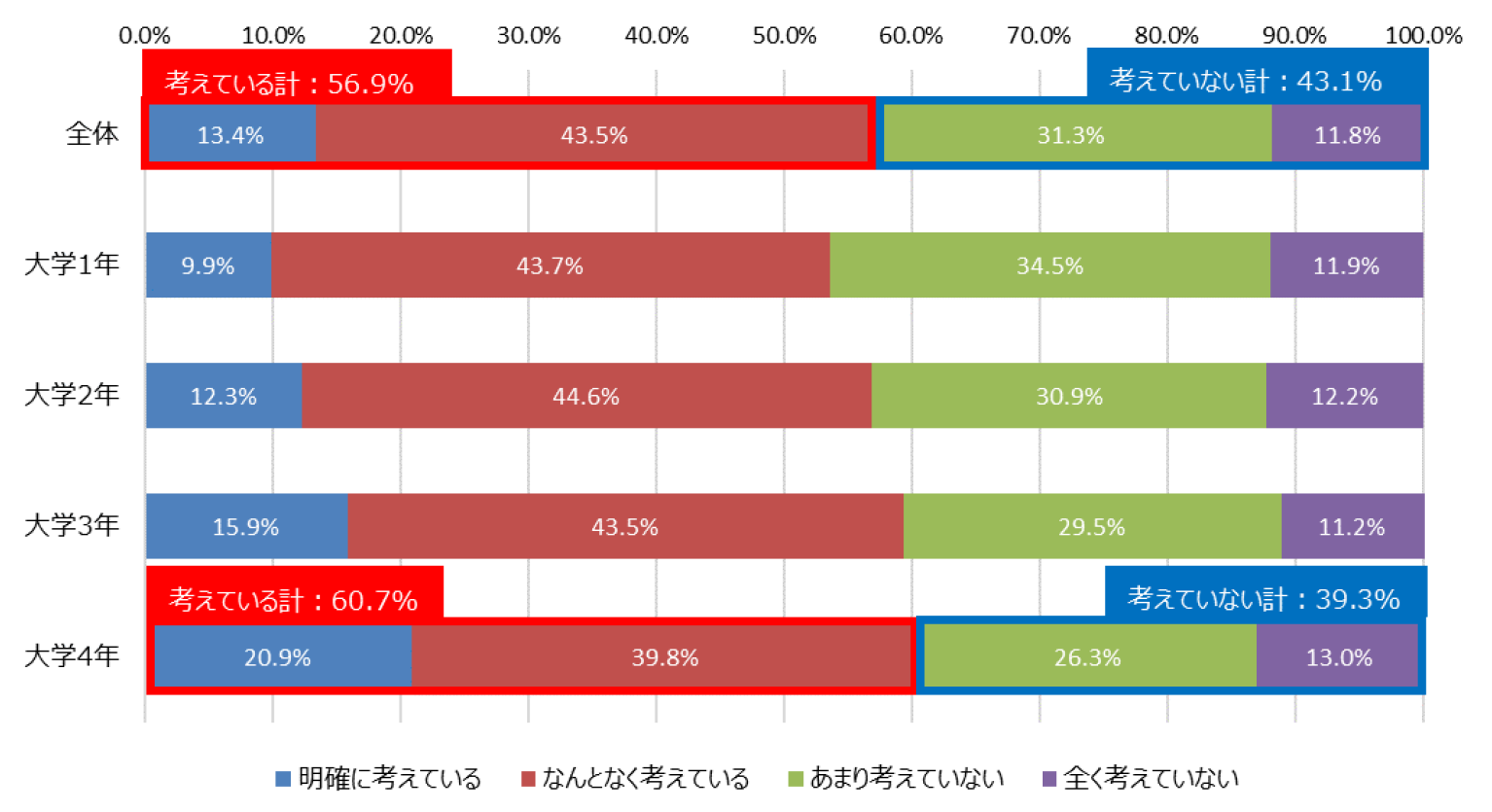 競技を辞めた後のキャリアについて、「考えている」と回答したのは56.9%で、「考えていない」と答えたのは43.1%だった。卒業が迫った大学4年生以降の学生においても、「考えていない」と回答した割合が39.3%に上った。【図5】