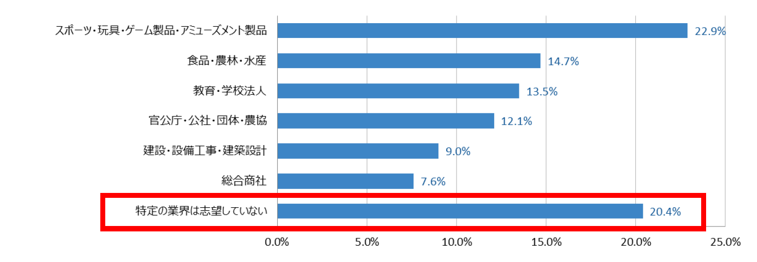 希望する業種を聞いたところ、最も多かったのは「スポーツ・玩具・ゲーム・アミューズメント(22.9%)」だった。2位は「特定の業界は志望していない(20.4%)」で、「食品・農林・水産(14.7%)」「教育・学校法人(13.5%)」が続いた。自身に馴染みのあるスポーツ業界を志望する学生が多いが、「特定の志望業界がない」という回答も一定数あり、自身が志望するキャリアや将来の展望について検討が進んでいない様子がうかがえる。【図6】