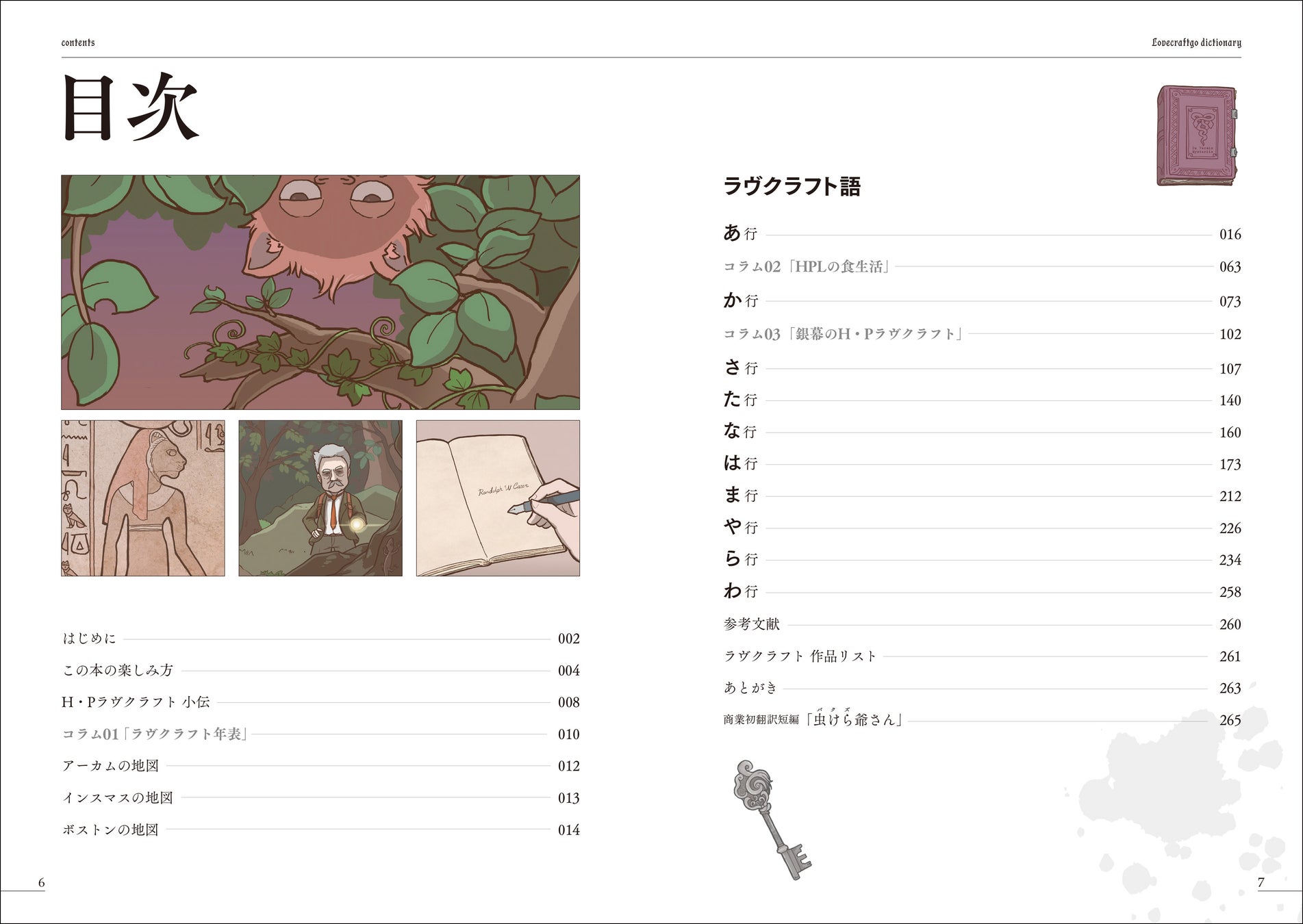 そのほか、ラヴクラフトの食生活や映画化作品にまつわるコラム、アーカムやインスマスといった架空都市の地図も掲載。