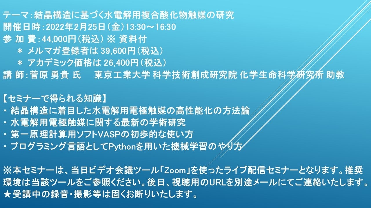 先端技術情報や市場情報を提供している(株)シーエムシー・リサーチ(千代田区神田錦町: https://cmcre.com/ )では、 各種材料・化学品などの市場動向・技術動向のセミナーや書籍発行を行っておりますが、 このたび「結晶構造に基づく水電解用複合酸化物触媒の研究」と題するセミナーを、 講師に菅原 勇貴 氏 東京工業大学 科学技術創成研究院 化学生命科学研究所 助教)をお迎えし、2022年2月25日(金)13:30より、 ZOOMを利用したライブ配信で開催いたします。 受講料は、 一般:44,000円(税込)、 弊社メルマガ会員:39,600円(税込)、 アカデミック価格は26,400円(税込)となっております(資料付)。