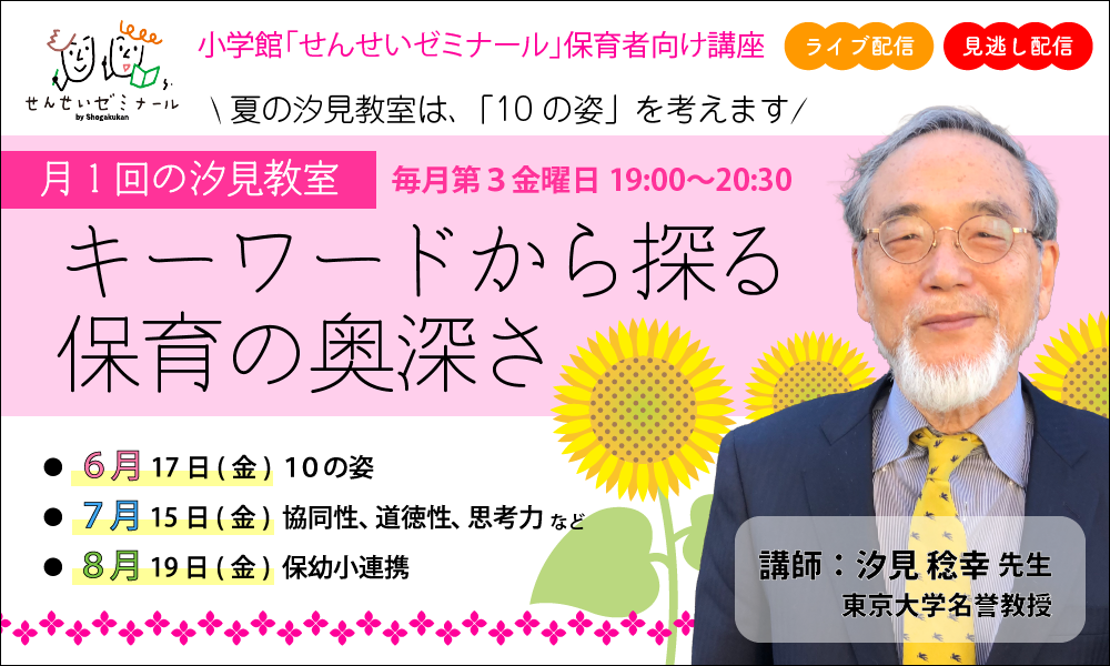 ⼩学館【せんせいゼミナール】 月1回の汐見教室 キーワードから探る保育の奥深さ〈6月のテーマ︓10の姿〉 講師︓汐⾒稔幸先⽣ 6/17開講 申込受付中︕