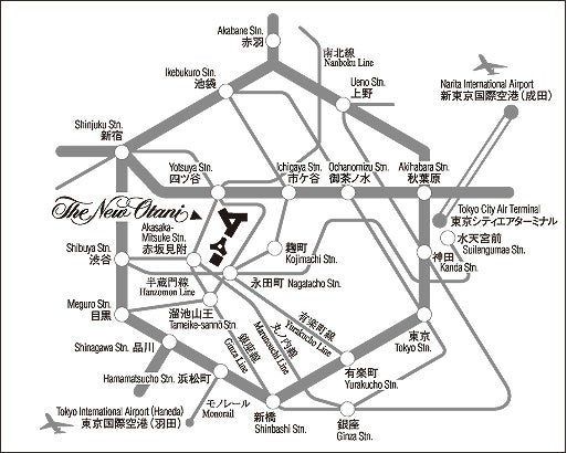 ホテル徒歩圏内に4つの駅があり、6路線をご利用いただける抜群のロケーションにホテルニューオータニはあります。(赤坂見附駅より 徒歩3分/四ツ谷駅より 徒歩8分/永田町駅より 徒歩3分/麹町駅より 徒歩6分)。東京駅、銀座、六本木からは車で約15分、新宿駅からは約20分と、ビジネス、ショッピングに大変便利な立地です。