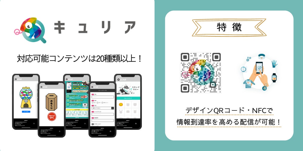イベントの集客・回遊・滞在施策で活用できるアプリレスのWEBコンテンツツール「キュリア」を出展します。スマホでできる「スタンプラリー」「福引」「ルーレット」など、20種類のコンテンツから選べます。さらに、QRコードの背景に好きな画像を透過できる「デザインQR」も提供が可能。子どもでもお年寄りでも直感的に使えるキュリアをぜひ体験ください。 ※QRコードは株式会社デンソーウェーブの登録商標です。