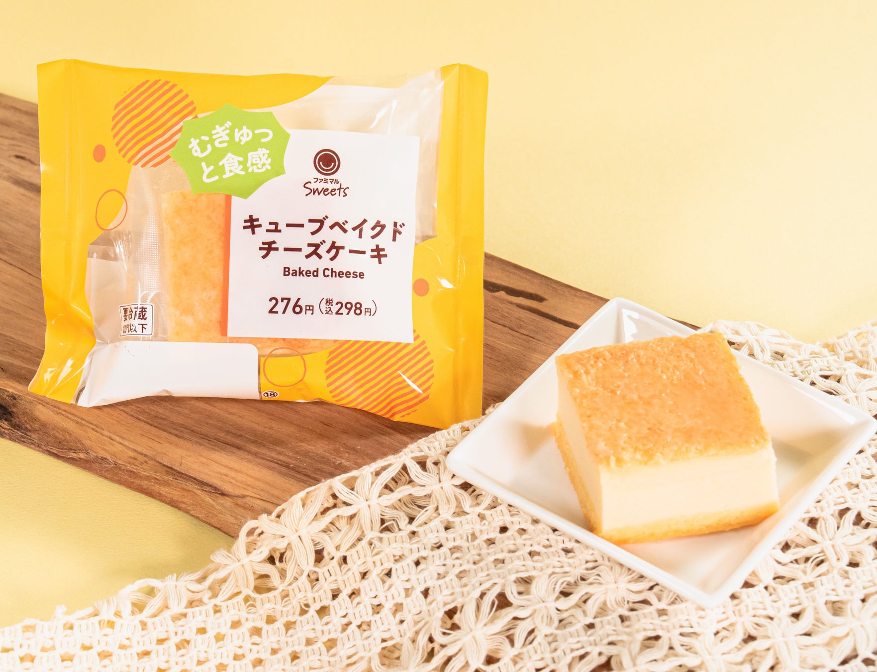 【内容】キューブ型のベイクドチーズケーキです。スポンジ生地にベイクドチーズケーキをのせた2層のチーズケーキです。むぎゅっとつまった食感が特長で4種のチーズ(チェダー、ゴーダ、パルメザン、カマンベール)入りチーズペーストを使用しています。※数量限定