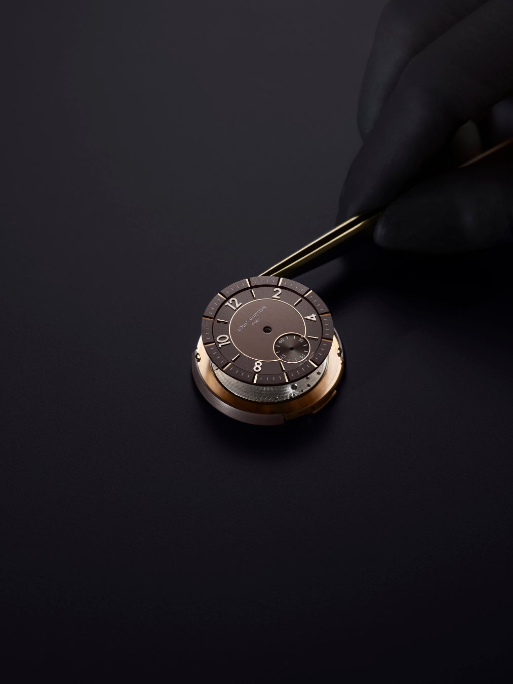 ケースの洗練された構造には、内部にゴールドのコアが組み込まれています。ウォッチの裏側に見えるゴールド製のケースバックが、そのプレシャスさをより一層際立たせます。ムーブメントを保護するために設計されたこのインナーコンテナは、セラミック部品で覆われています。同じくセラミック製のドラム型のリューズにはフルート加工が施され、「LV」シグネチャーを刻印。彫刻的なラインは、卓越した仕上げによって美しく彩られています。2枚のセラミックカバーのサテン仕上げには、細心の手作業が求められます。ベゼルは丹念に手作業で磨かれた後、サンドブラスト加工が施され、ポリッシュ仕上げの「LOUIS VUITTON」の12文字が際立ちます。