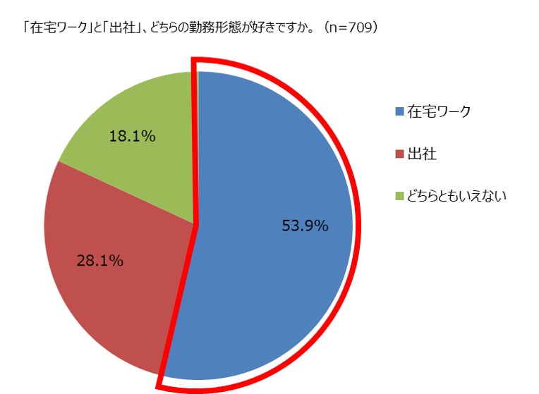 1. 24.7%が月一回以上在宅ワークを実施しており、53.9%が在宅ワークの方が好きだと回答