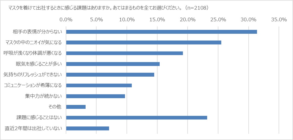・出社する際の課題は、「相手の表情が分からない」が最も多く、「マスクの中のニオイ」が25.5%で2番目に多い。