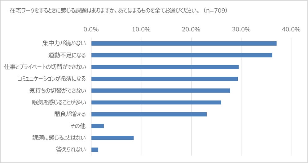 ・在宅ワーク中の課題は「集中力が続かない」が最も多く37.1%で、「運動不足になる」が2番目に多い。