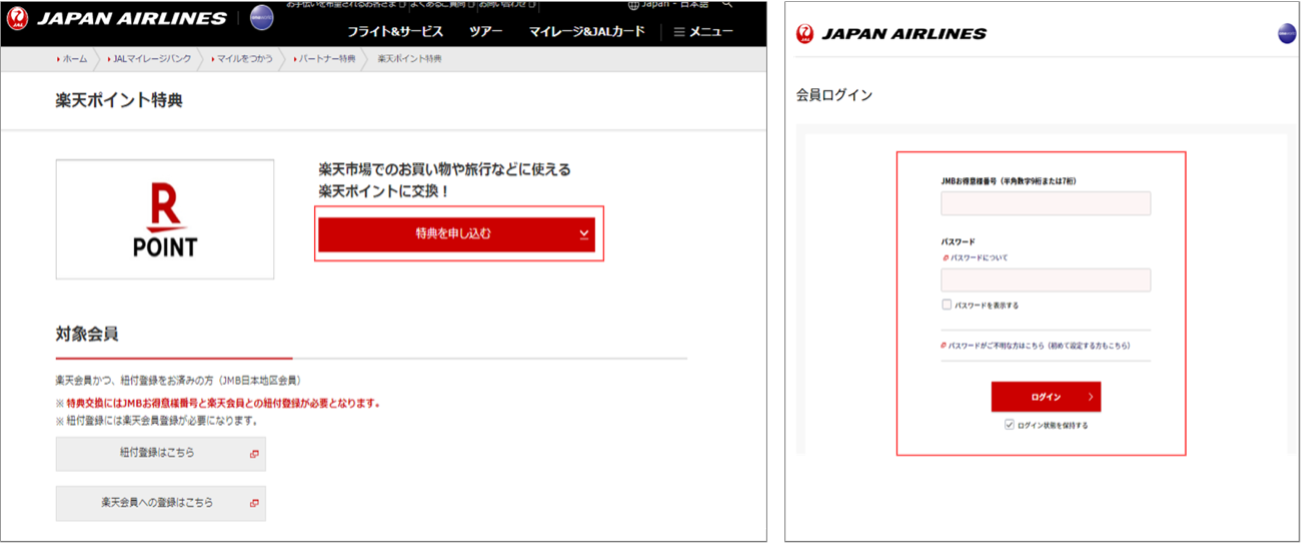 <「楽天ポイント特典」からJMBお得意様番号とパスワードでのログインのイメージ>