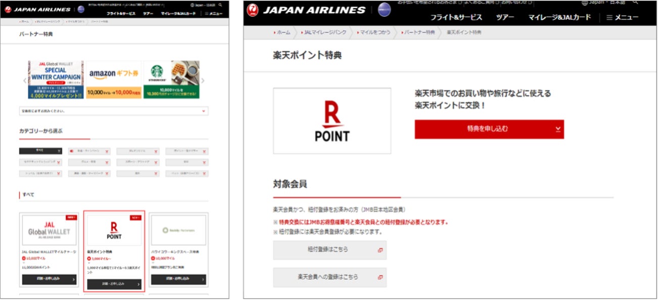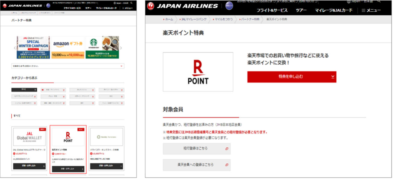 1. 「JALマイレージバンク」から「マイレージ&JALカードページ」メニュー内の「提携先のポイントや商品(パートナー特典)」を押し、楽天ポイント特典の「詳細・お申し込み」を選択、「楽天ポイント特典」へアクセス