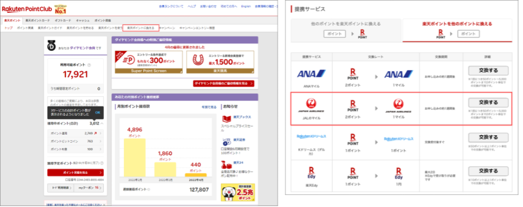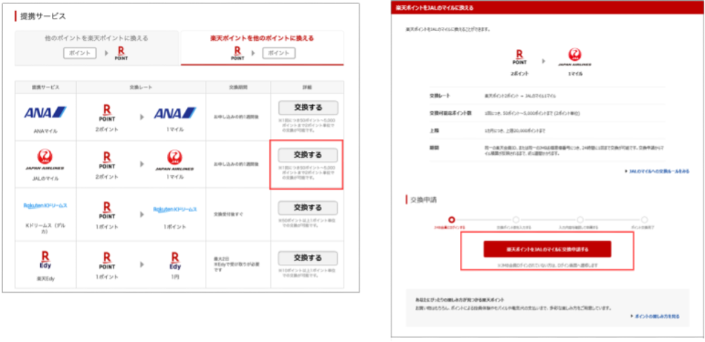 ・「楽天ポイント」から「JALマイル」に交換(交換上限:20,000ポイント/月)