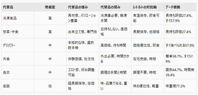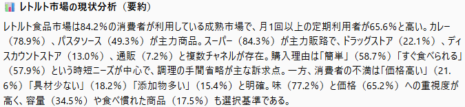 レトルト食品市場は定期利用者の安定した需要がある一方、「高価格」「具材の少なさ」「添加物」への不満が一定数あり、商品改善による成長機会が示唆されました。