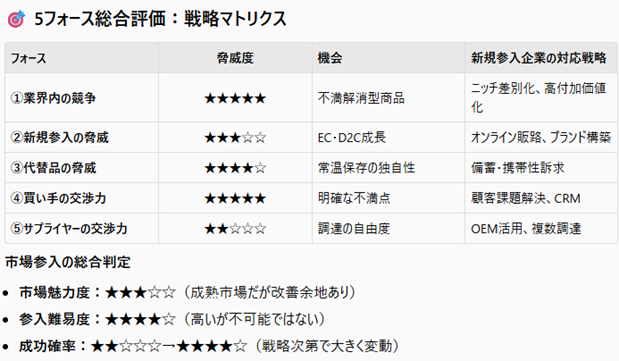 次に【5フォース分析・新規参入視点】を指示したところ、各フォースの脅威度とその要因が示されました。