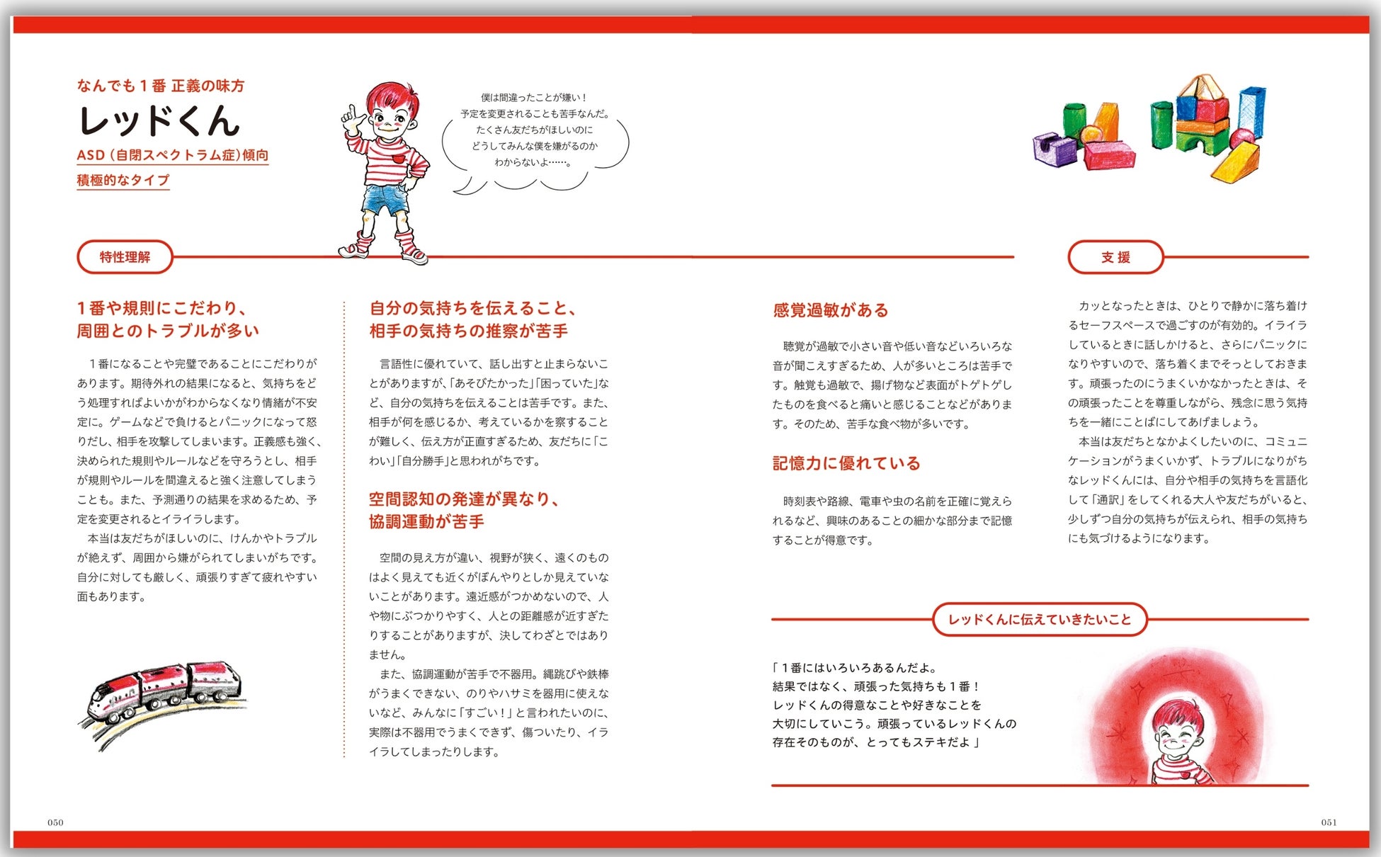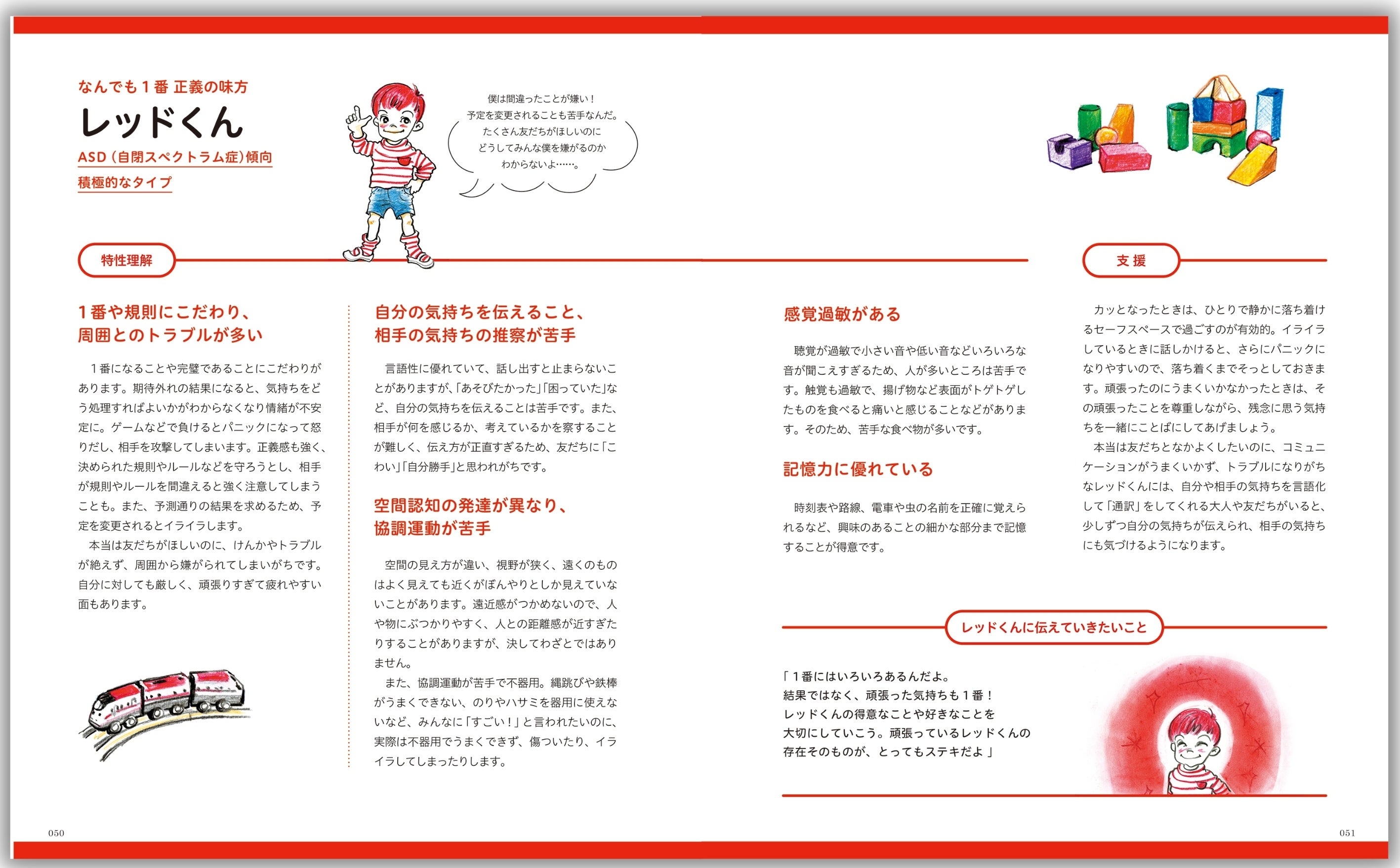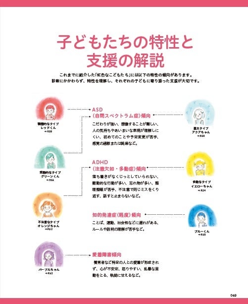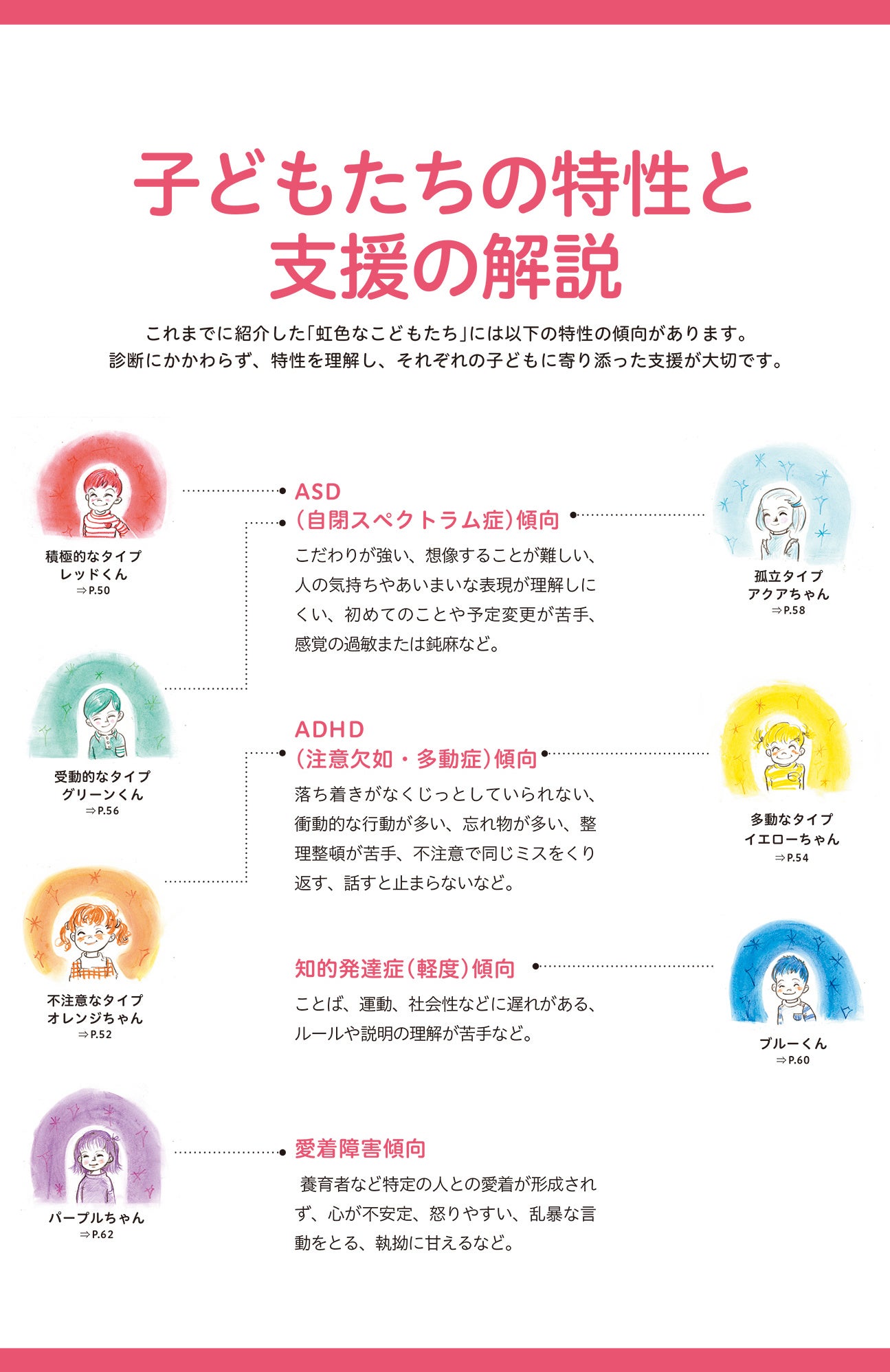 巻末には詳しい解説ページも。子どもたちの特性の傾向をASD(自閉スペクトラム症)傾向、ADHD(注意欠如・多動症)傾向、知的発達症(軽度)傾向、愛着障害傾向の4つの傾向とともに、より詳しく解説します。また、7色の子どもたちが、自分の色を大切にして輝いていくために伝えていきたいメッセージをつけています。