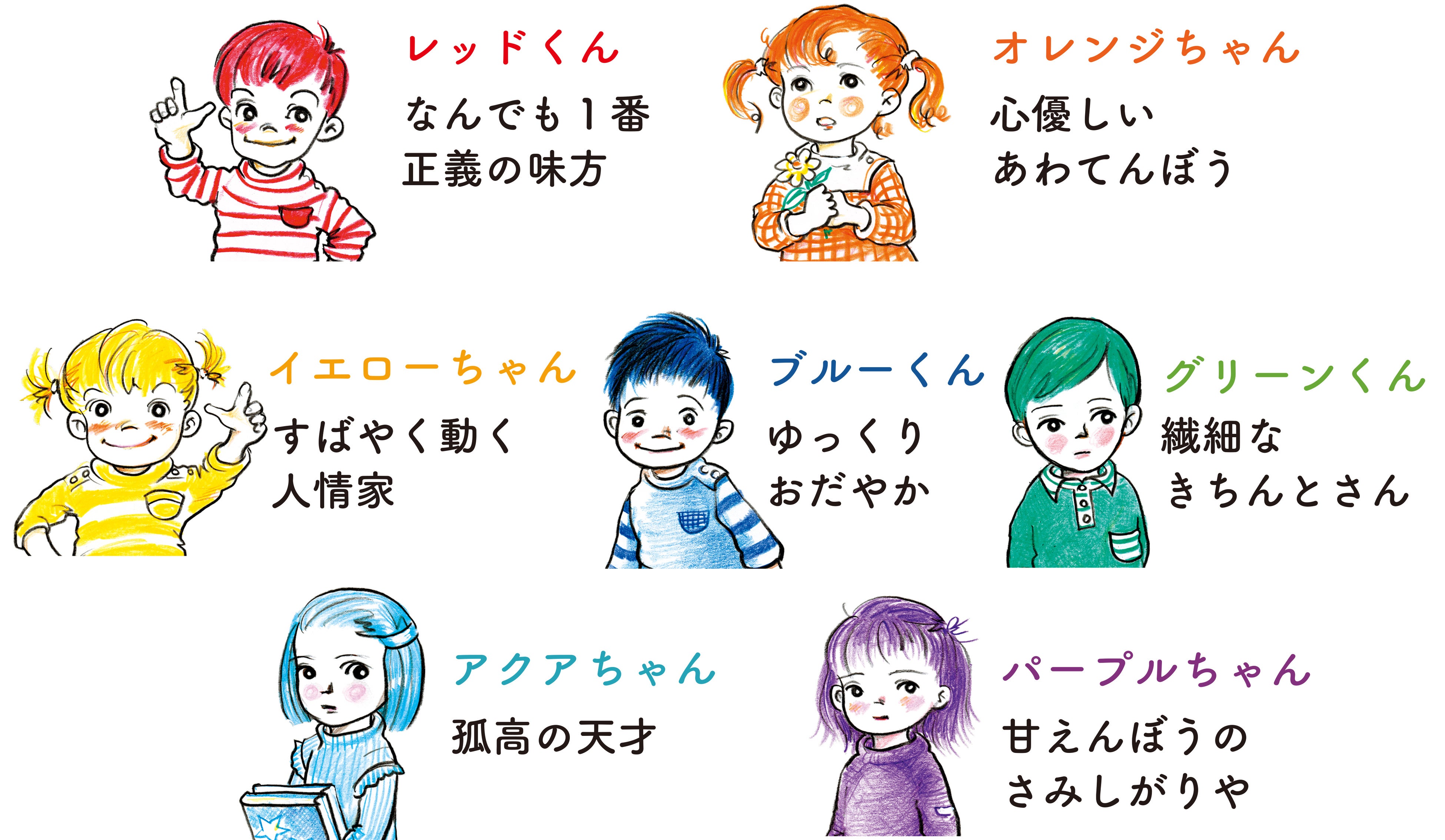 本書『虹色なこどもたち』では、多様な子どもたちの発達を虹色に例え、特性の傾向を7色に分けて紹介します。レッド、オレンジ、イエロー、グリーン、アクア、ブルー、パープル。