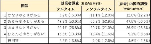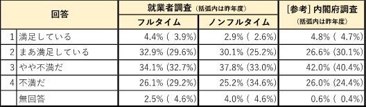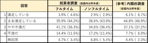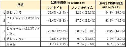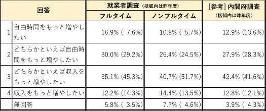 収入と自由時間のあり方についても、フルタイム・ノンフルタイム就業者とも、昨年度と比べて「自由時間を増やしたい」とする割合が増加し、「収入を増やしたい」とする割合が大きく減少。業務の繁忙化傾向を踏まえ、これ以上の業務増加による収入増加を望んでいない就業者の意識が現れている。