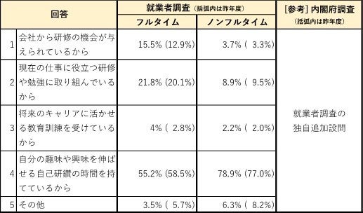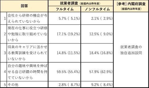 前問(Q3-(3))における「自己啓発・能力向上」面の満足度について、その回答理由を聞いたところ、フルタイム就業者については、会社による研修や現在の仕事に役立つ研修等についての満足度が昨年より上がる一方、自分の趣味等に関する自己研鑽の時間を持ててないことについて不満が増加している。
